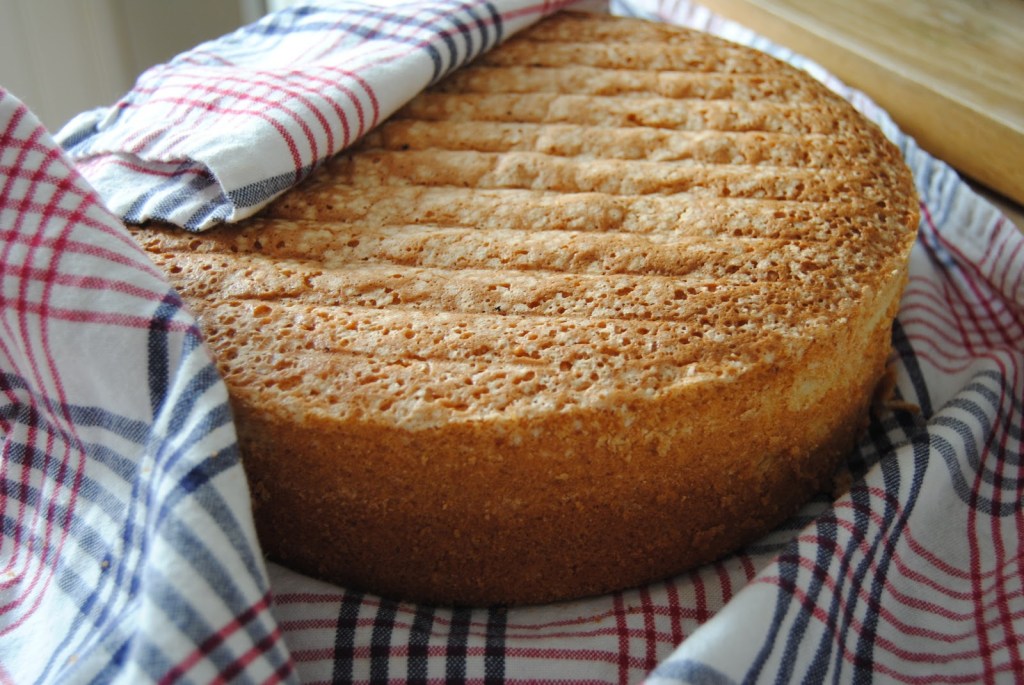 Vispa äggen och sockret poröst, tillsätt mjölet+ bakpulvret och vänd försiktigt runt så att smeten blir slät. Häll upp i smörad och bröad form och grädda i 175 grader ca 30-35 min.