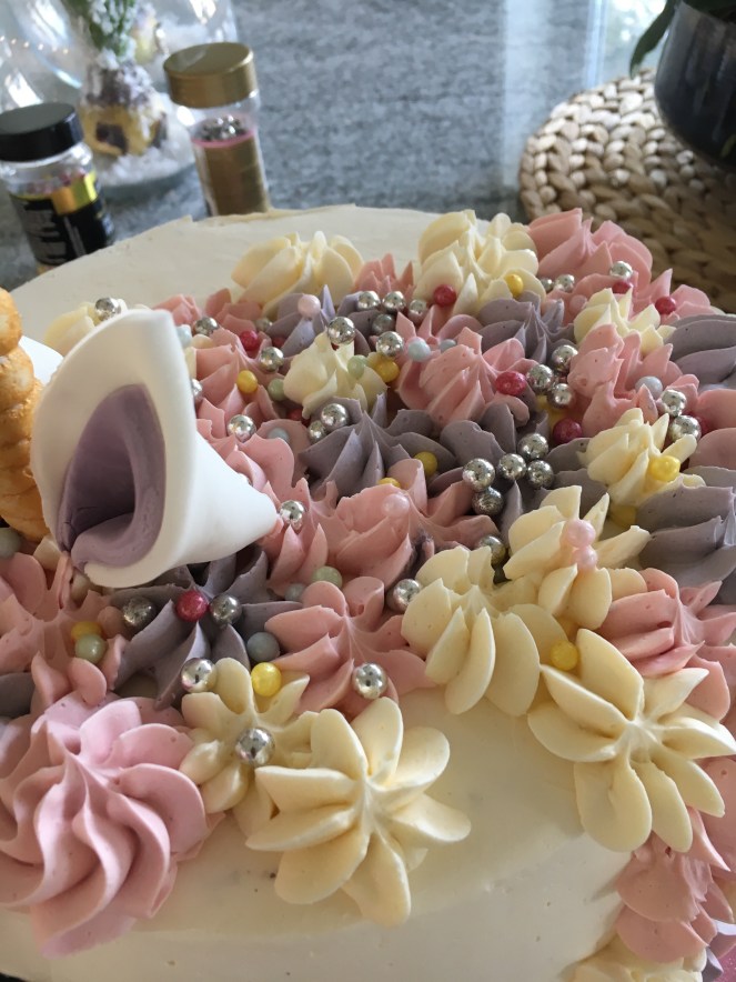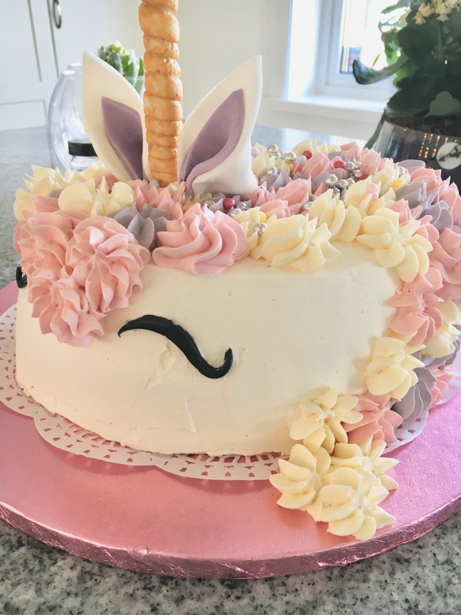 Nu är Liljas tårta klar och snart ska vi bege oss på 4års kalas. Tårtan ska föreställa en enhörning och är gjord på två bottnar ” lika delar” se tidigare inlägg. I tårtan finns det jordgubbar hallon vaniljkräm och grädde. Helan tårtan är spacklad och spritsad med marängsmörkräm (ingen diettårta precis)