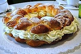 En vanlig bulldeg, fläta, jäsa och pensla med uppvispat ägg. Grädda och fyll den delade kransen med mandelmassa blandat med ovispad grädde så den blir lite lösare och rosta lite hackad mandel i stekpannan och blanda i. Bred på fyllningen och spritsa rikligt med tjock grädde, på med locket och pudra över massa florsocker. Klart.