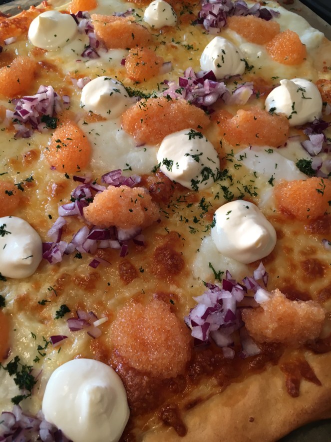 Jag använde mig av en färdig pizzabotten som jag bredde på creme fraiche och rivenost. Jag lade också på lite buffel mozzarella och grädda den på 220grader tills den fått fin färg. När ostpizzan var klar klickade jag på mer creme fraiche, hackad rödlök och löjrom och lite hackad dill.