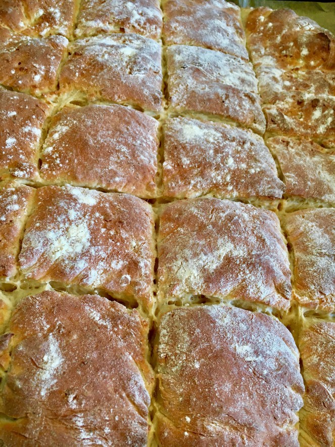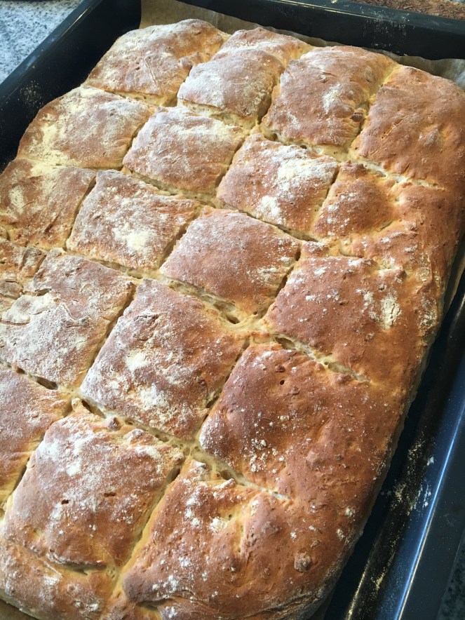 Jäs 30 min, tryck ut i långpanna ( smord el på bakplåtspapper) jäs 30min till. Grädda 220grader ca 20 minuter eller tills det fått fin färg