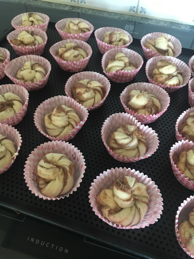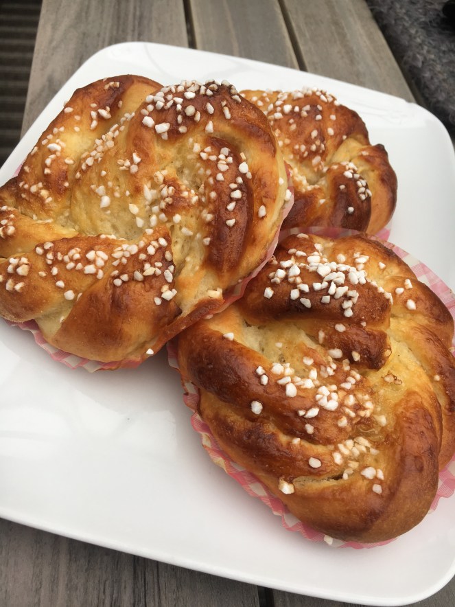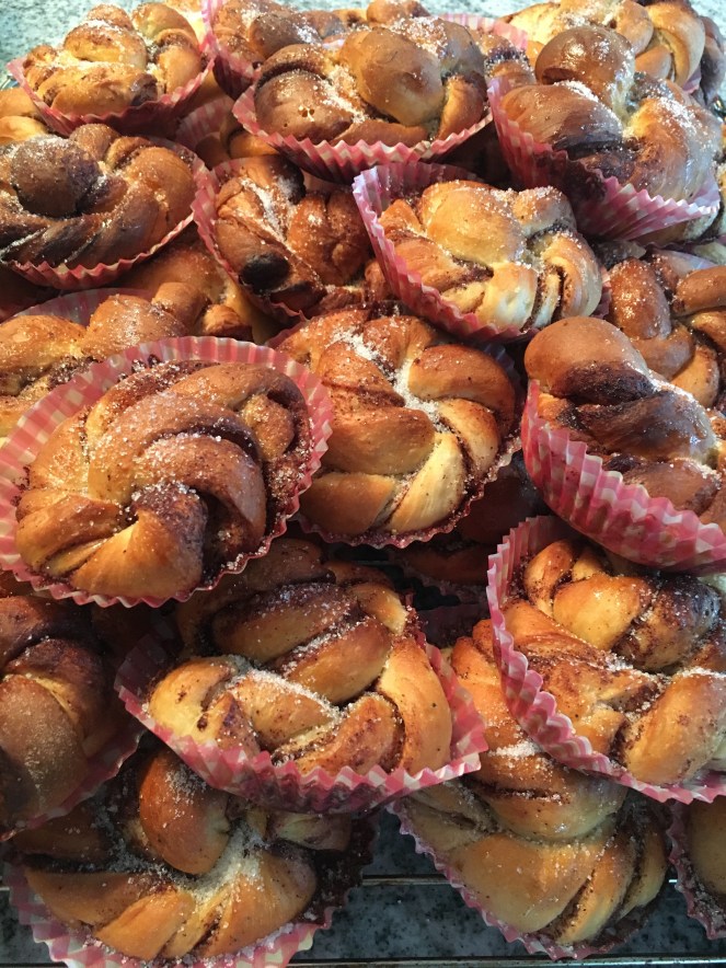 Mulet och regn denna söndag några dagar före den stundande semestern. Passar perfekt för bullbak. Bakade både kanelbullar med strösocker på och vaniljbullar med pärlsocker. Använde mig av ett för mig nytt recept på kalljästa bullar där man bakar ut och allt innan jäsning och bara jäsning en gång. Blev väldigt fluffig deg och stooora bullar