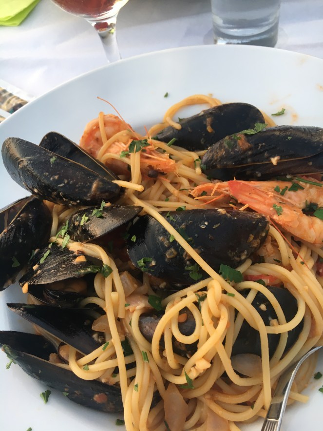 Restaurangen på stranden där vi ligger och jäser om dagarna har fantastiskt bra mat men stora portioner så idag delade vi en skaldjurspasta och det blev alldeles lagom. Utomlands tycker man inte det är något konstigt utan tar fram dubbla bestick. Hemma vågar man knappt dela och ofta påpekar servitören att man får betala extra för disk av extra tallrik. Jag tycker att det borde finnas hel och halvportioner för ibland orkar man inte så mycket eller att det inte är så konstigt att dela. Om man inte orkar äta upp packas maten ner i doggybag att äta senare, sker nästan inte heller hemma. Där har vi lite att ta efter