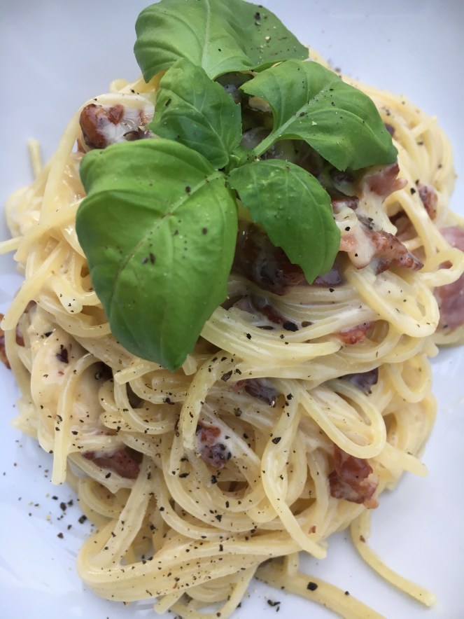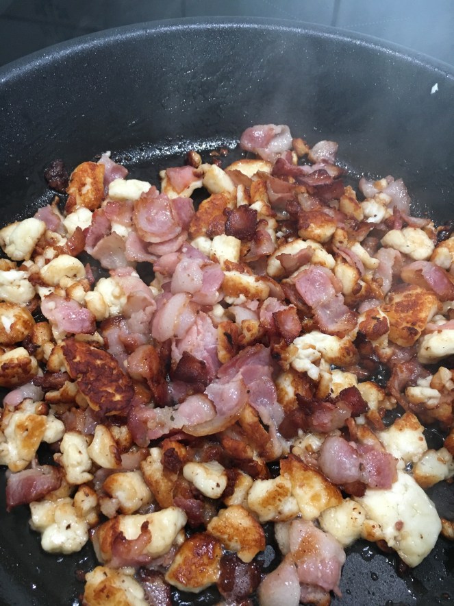 Carbonara är ju jättegott som det är men om man steker små bitar av halloumi samtidigt som man steker baconet blir carbonaran ännu godare