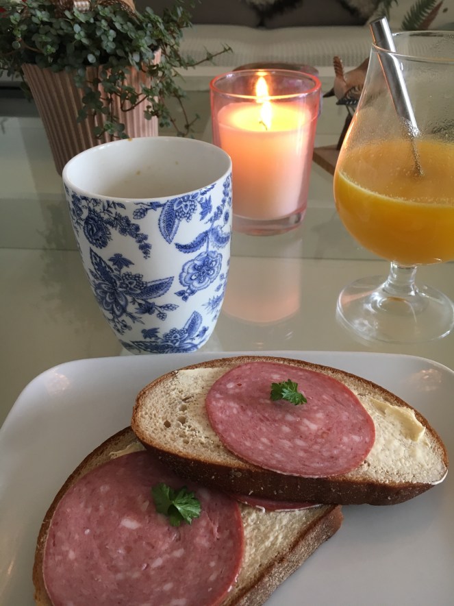 Ibland blir man så sugen på konstiga saker. Jag har varit sugen på skogaholmslimpa med prickig korv så det fick det bli till frukost idag.
