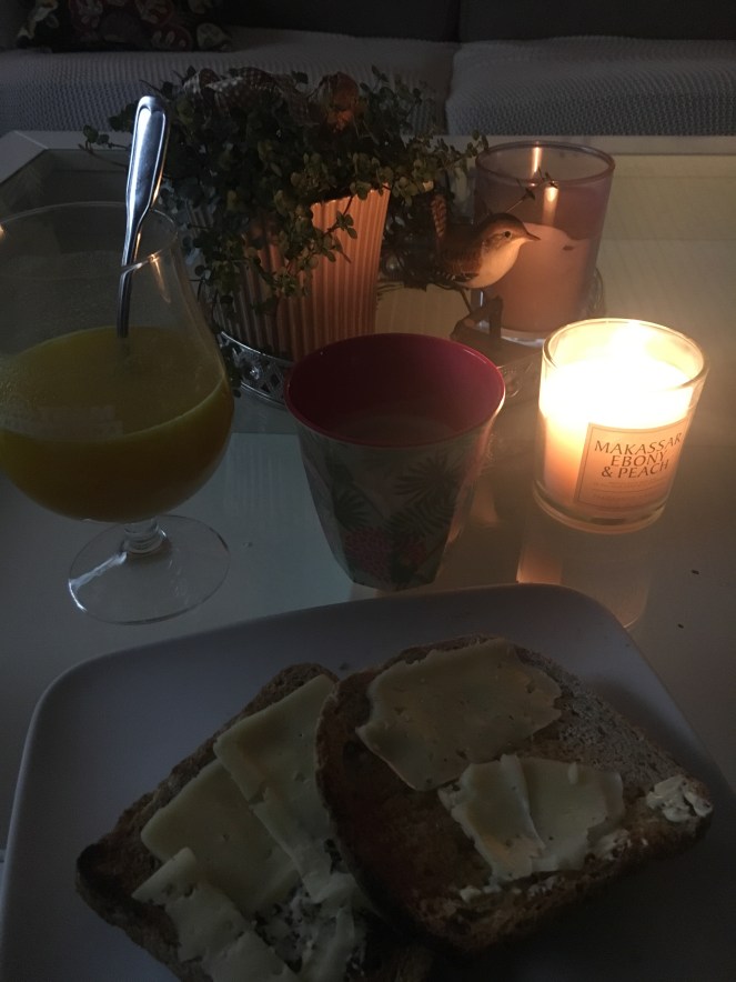 En frukost i min ensamhet, inget fancy utan ett par rostmackor med ost som det blev idag men en lugn stund med tända ljus och nyhetsmorgon. Lite starkt kaffe på det och jag är redo. Idag blir det en arbetslagsledare utbildning på högskolan väst. Trevlig onsdag