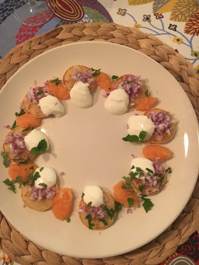 Lätt som en plätt. Ibland orkar man inte en hel middag utan kan göra en förrätt lite större. I kväll blev det blinier med löjrom, hackad rödlök och gräddfil. Lite vin till blev det också.