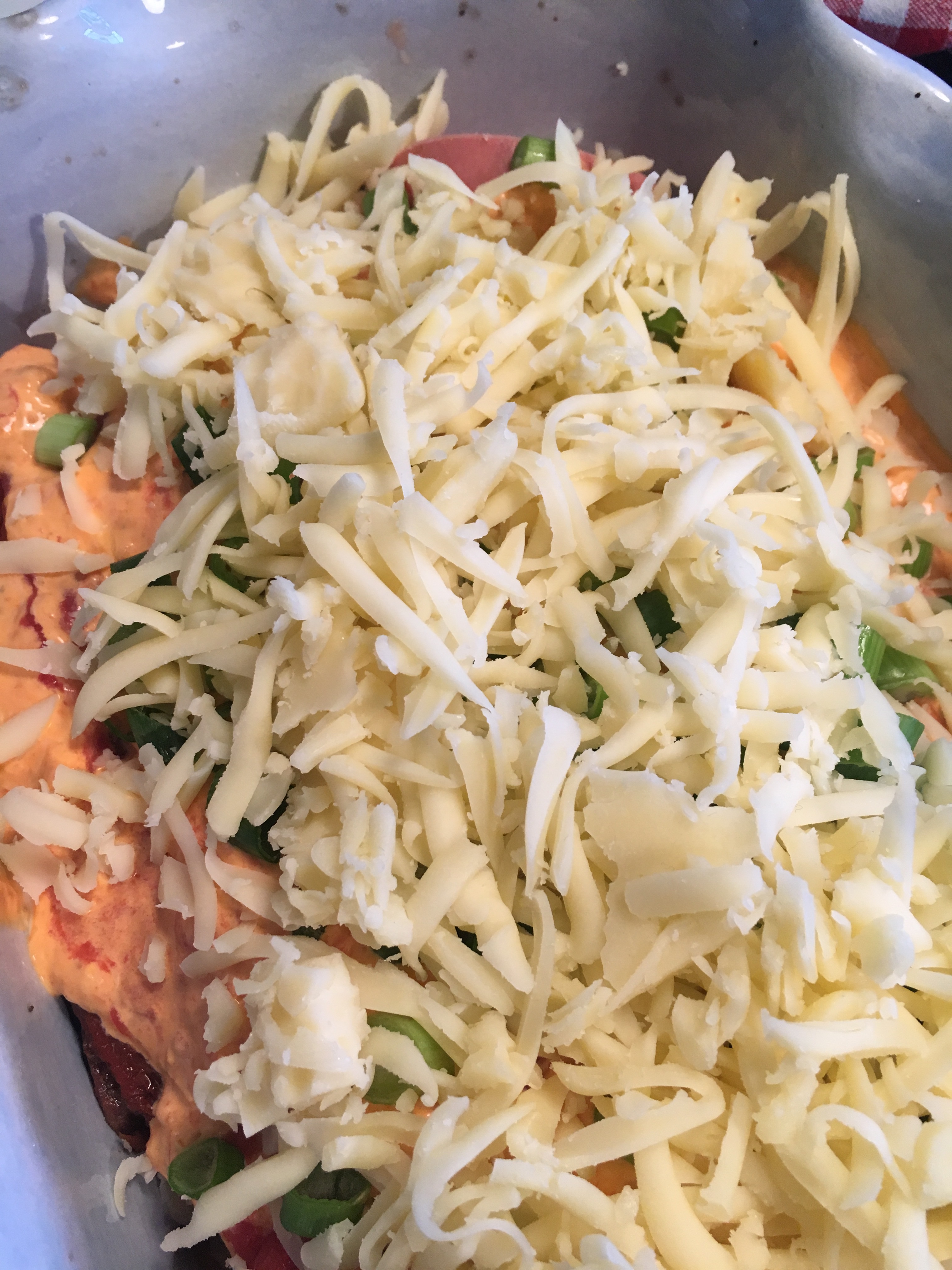 Skiva falukorv och lägg i botten på en form. Strö över strimlade soltorkade tomater, skivad salladslök. Slå över krossade tomater. Blanda cremefraiche med stark ajvar relish och bred över och toppa med ost. Jag serverade den till pasta.
