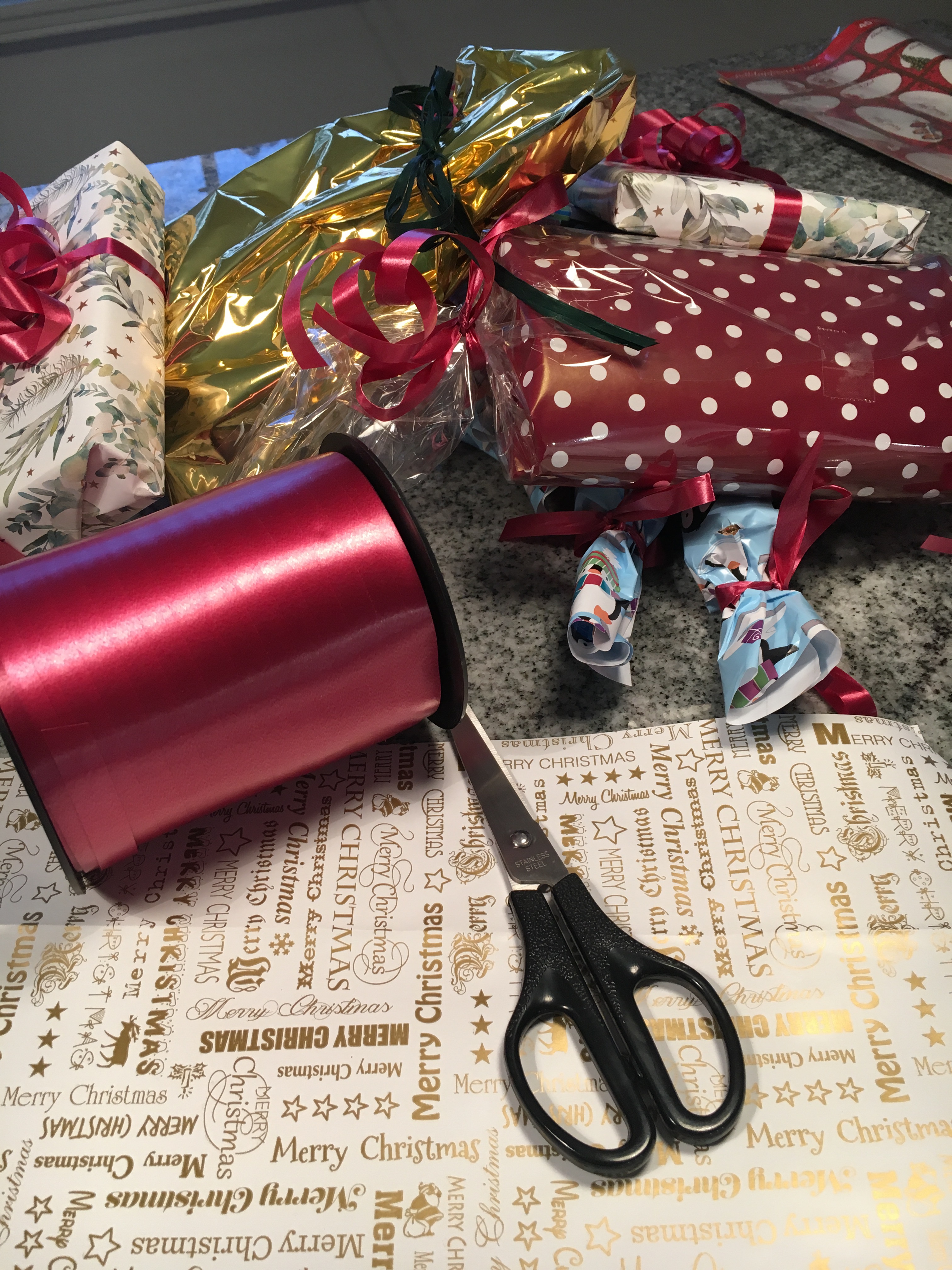 Tråkigt och grått ute så då passar jag på att slå in lite julklappar. Inget fancy här inte på inslagningsfronten. Den rätta julstämningen har liksom inte infunnit sig. Fast jag tycker att man gör det man tycker är roligt det andra köper man färdigt eller struntar i. Vissa år grejar man jättemycket och andra år lite mindre och det är helt okey.