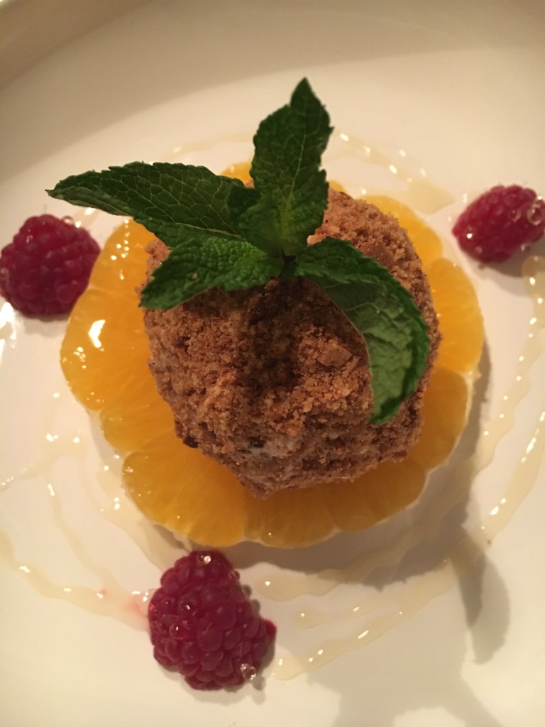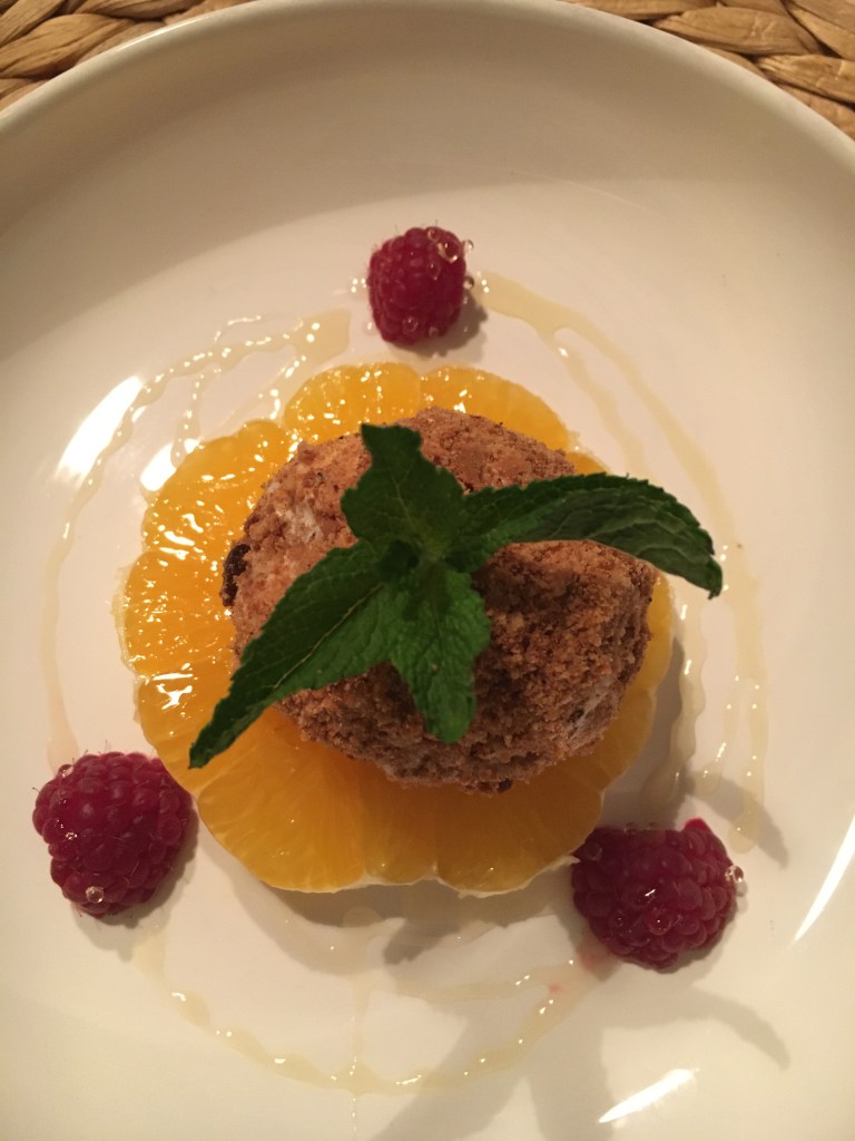 Rulla antingen köpt eller hemgjord glass i pepparkakssmulor. Detta kan göras i god tid och så styck fryser man glasskulorna på en bricka klädd med bakplåtspapper tills servering. Skala en apelsin och skär en skiva som läggs på tallrik. Ringla över honung och lägg glassen på apelsinskivan. Se till att glassen tinat lite så den inte är stenhård. Detta ska jag bjuda mina gäster på i kväll.