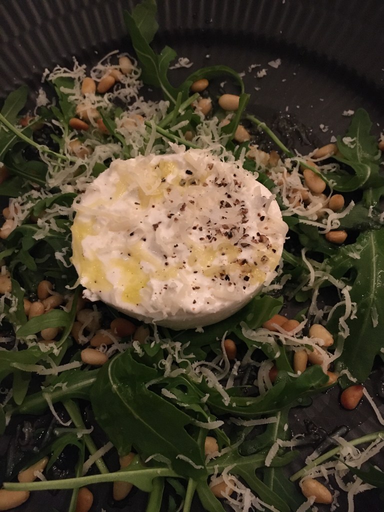 Först bubbel och sedan en jättegod förrätt med Burrata, rostade pinjenötter, ruccola och parmesan