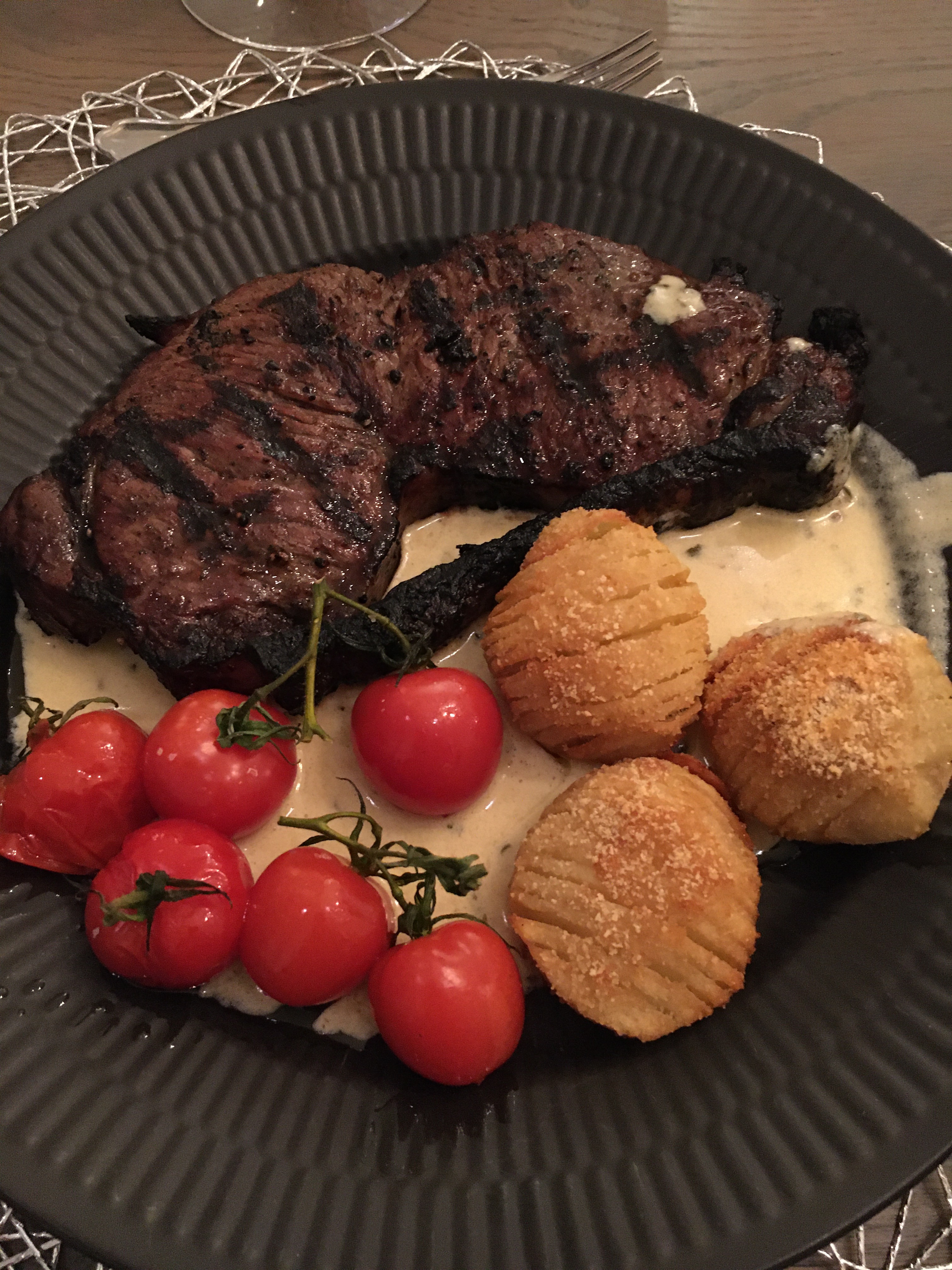 Därefter varmrätt med grillad hängmörad ryggbiff, hasselbackspotatis, grönpepparsås och grillade tomater.