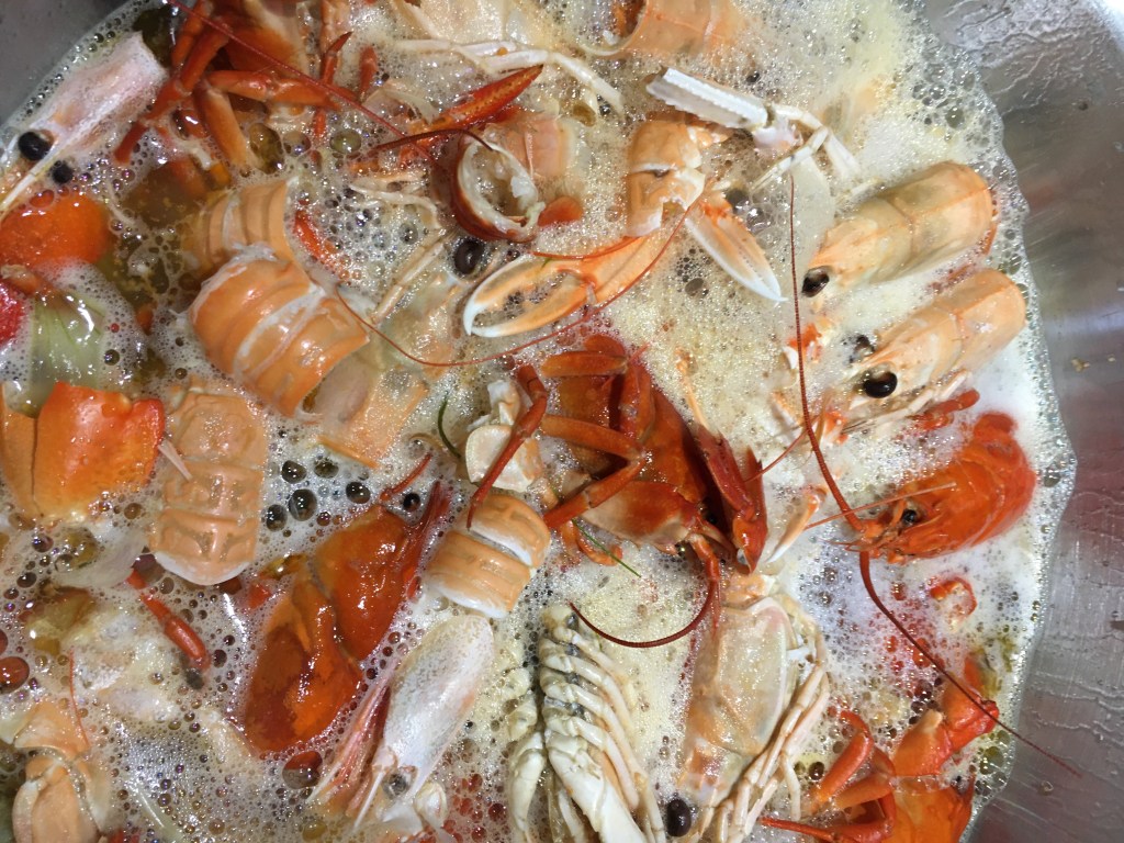 Fräs en hackad gul lök med slantar av två morötter i olja. Tillsätt två krossade vitlökar en msk tomatpuré och ca 2dl torrt vitt vin. Tillsätt dina skal och täck med vatten. Koka ca 30 min. Sila av och koka spadet ytterligare för mer koncentrerade smak. Här tillsätter jag lite sambal olek för lite hetta.