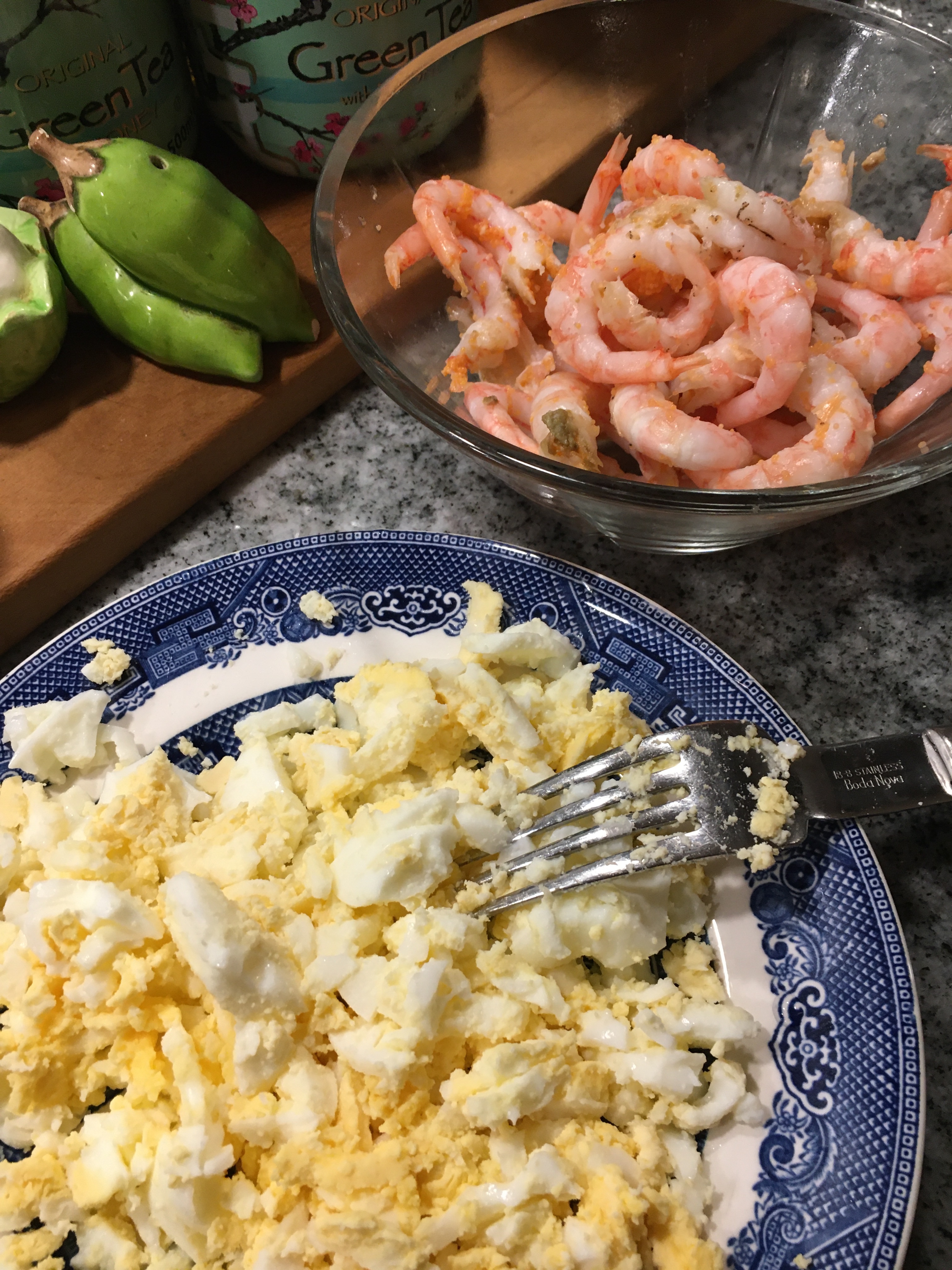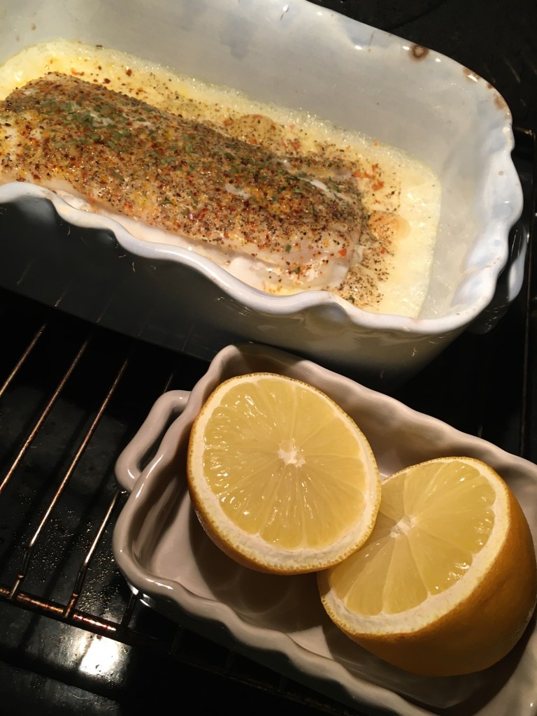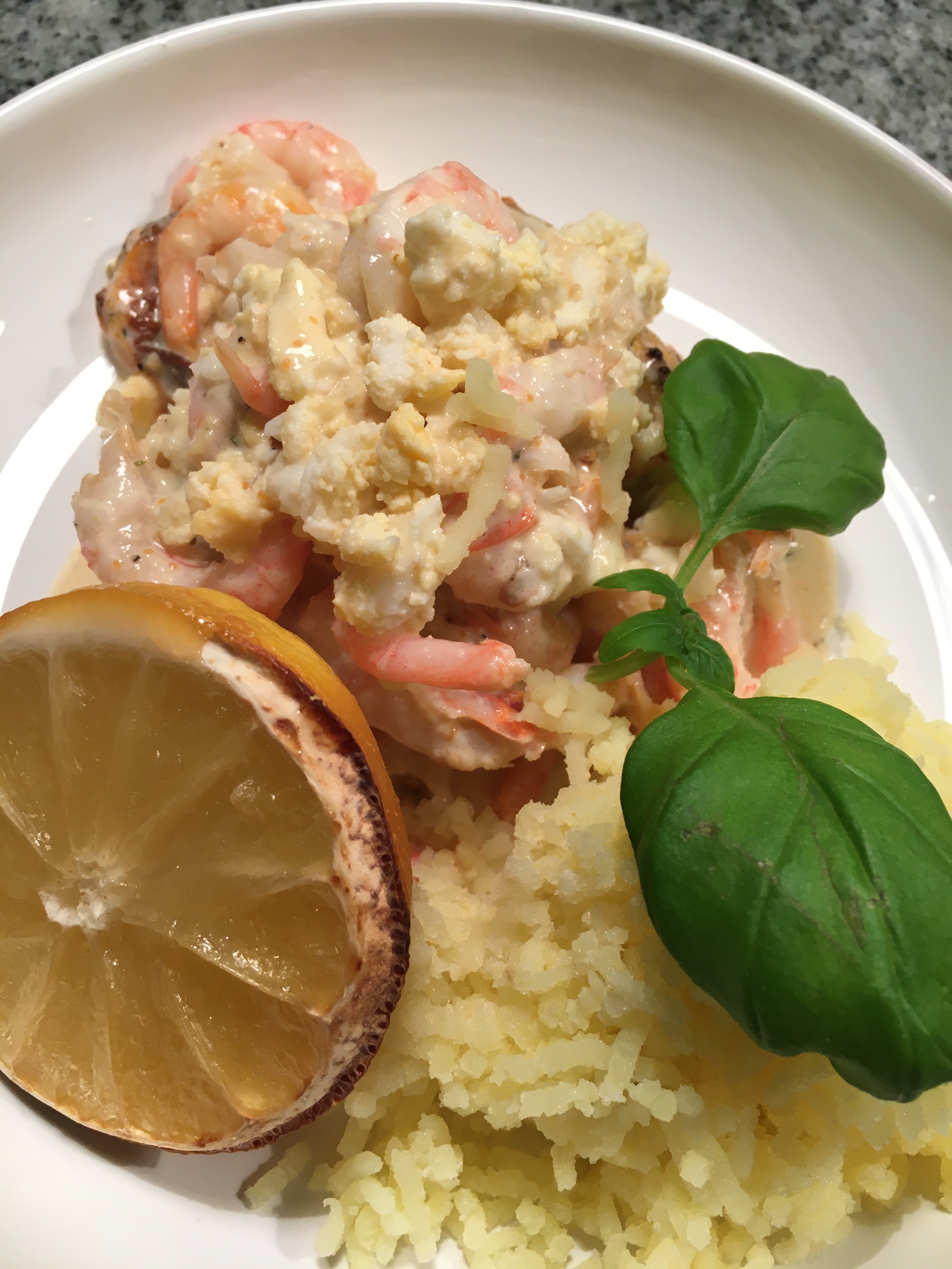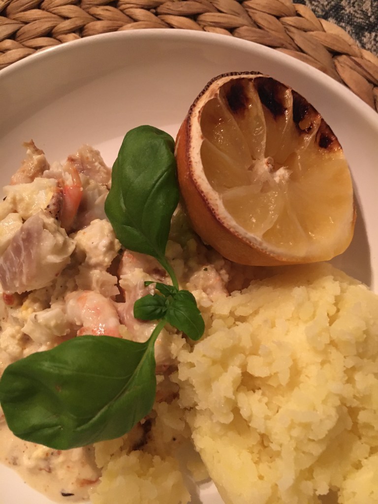 Du behöver ett fruset fiskblock som du lägger i en ugnsform. Salta och peppra fisken. Ta 4dl grädde och häll i 1msk örtsalt, jag tog lite olika kryddor som jag gillar till fisk och lite torkad chili. Slå över fisken och sätt den på 170 grader i en timme. När fisken är i ugnen så skalar du räkor, jag hade en påse räkor med skal i frysen som jag tinat. Koka två ägg och hacka. När fisken är klar fördelar man räkor och ägghacket över fisken. Jag serverade fisken med pressad potatis och ugnsbakad citron.