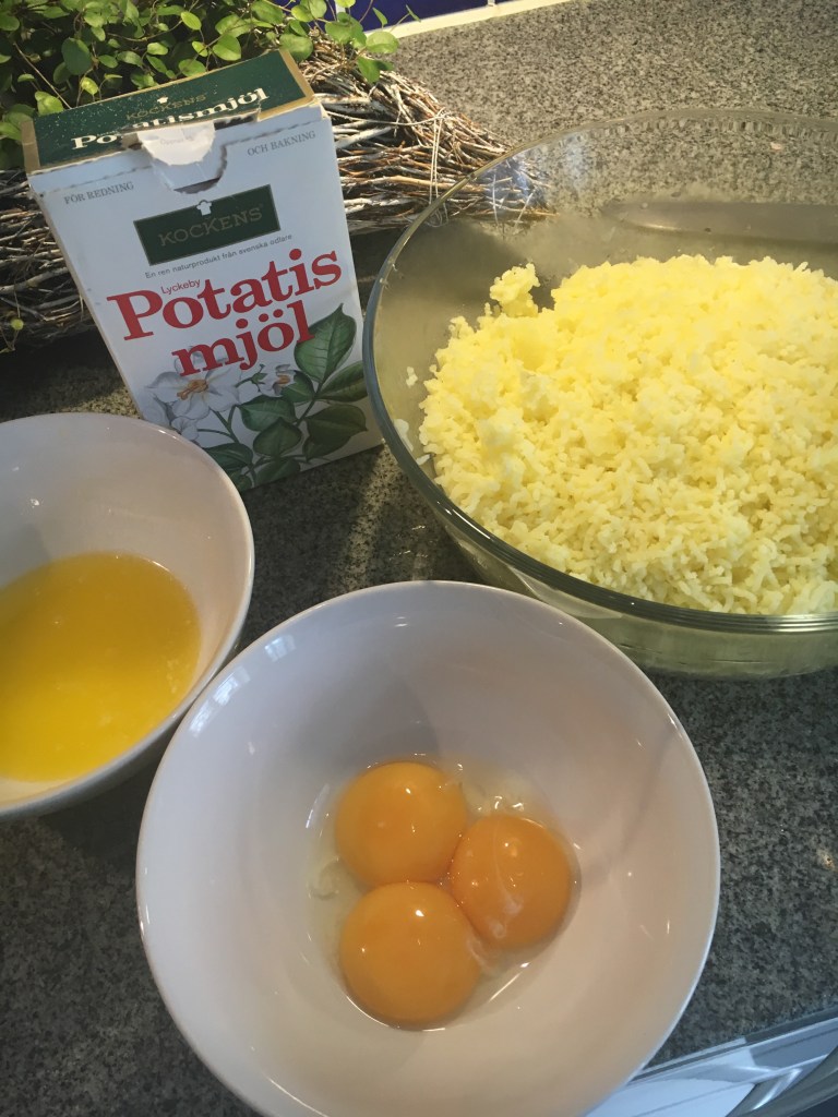 Koka potatisen klar och pressa den i en bunke. Rör ner övriga ingredienser, sist gulorna så du får en deg.