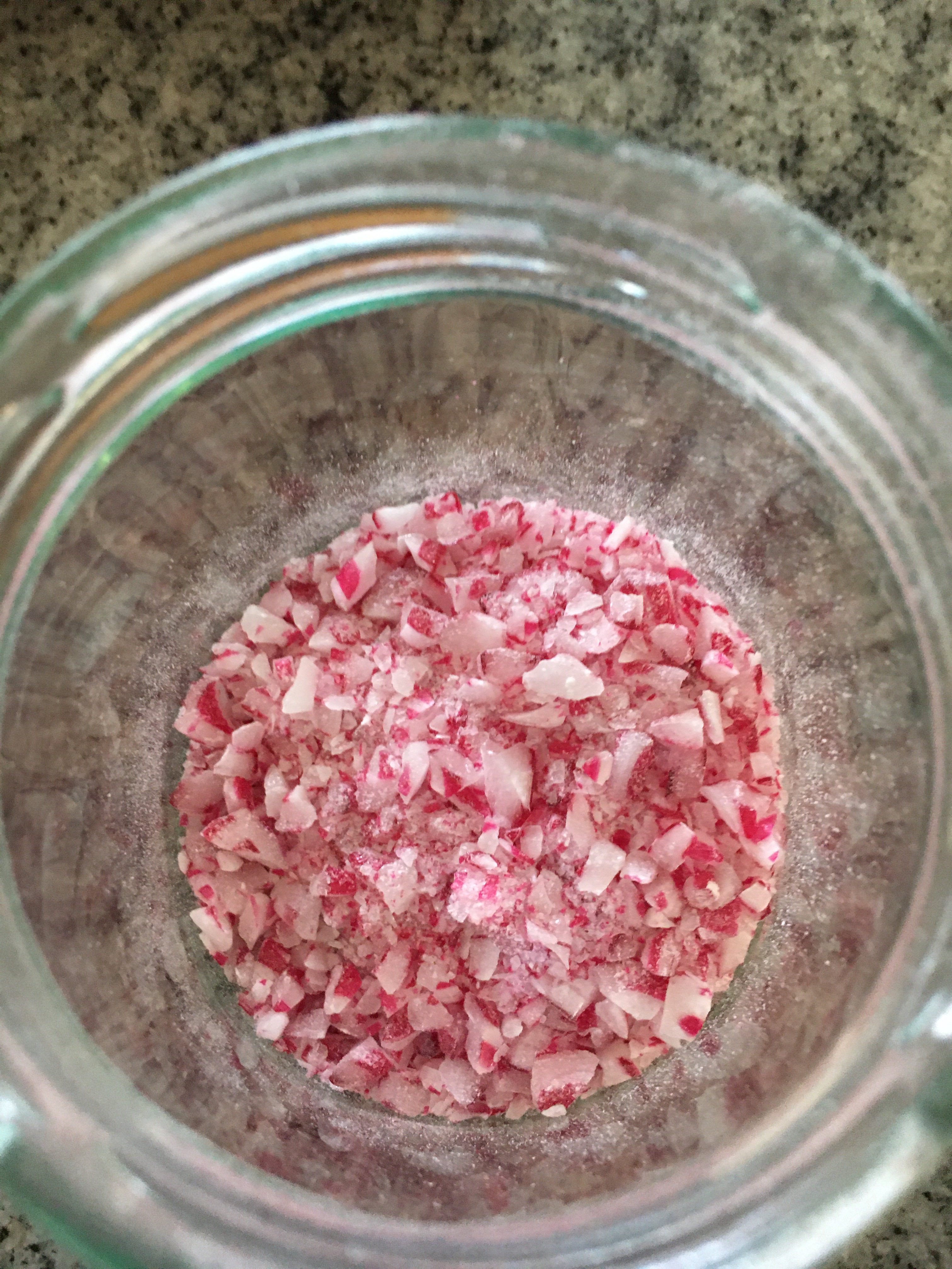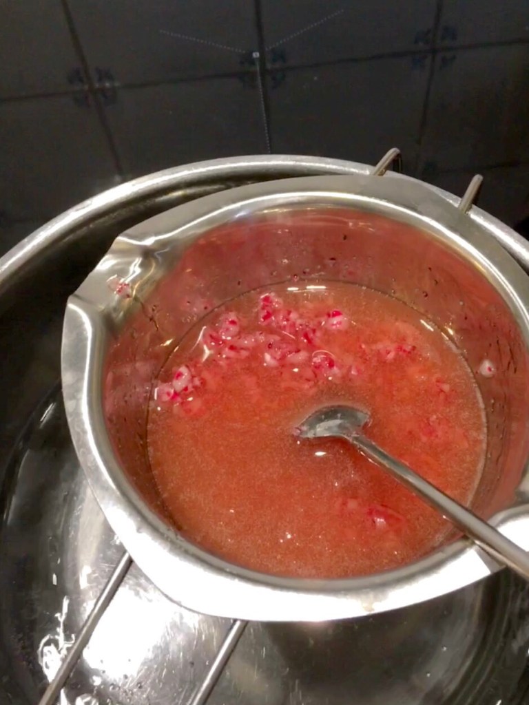 Jag tänkte mig en sirap att ringla över glass. Så jag krossade polkagrisarna och blandade dem med flytande honung som jag sedan smälte ihop över vattenbad. Jag tillsatte också en matsked vatten så den inte blir för trögflytande.