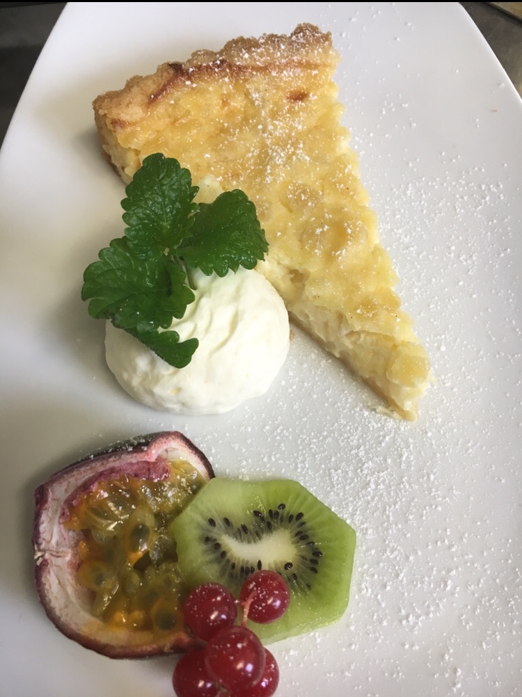 Fyllning: rör ihop 1 ägg, 2dl cremefraiche, 1dl socker, 1tsk vaniljsocker och 500g väl avrunnen krossad ananas. Häll fyllningen i pajskalet och grädda i 175grader i ca 40 minuter. Låt svalna och servera med grädde eller glass