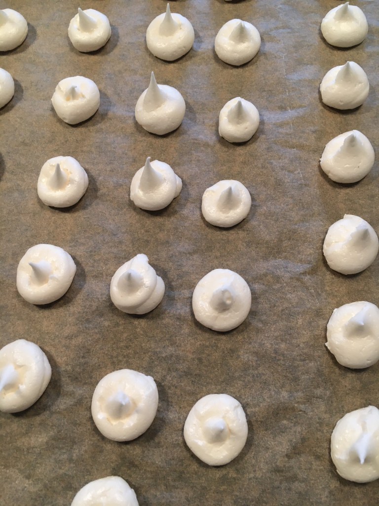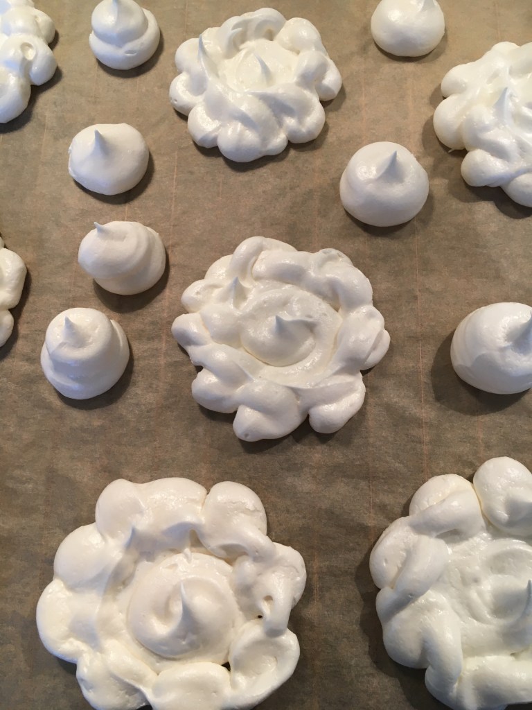 3 äggvitor vispas med 1krm ättika och 0,5dl socker på medelhastighet i två minuter. Tillsätt 0,5dl socker och vispa på hög hastighet i fyra minuter. Vänd ner 1dl siktat florsocker och spritsa valfria maränger.