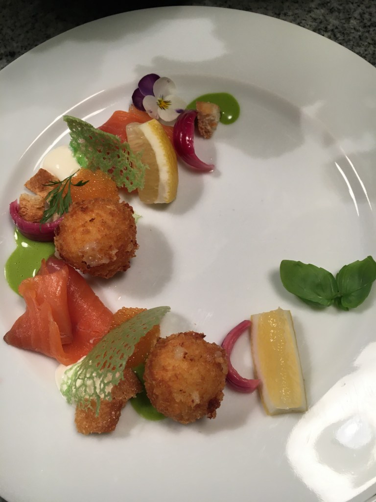 Friterade potatiskroketter, rökt lax, löjrom och ramslöksmajonnäs