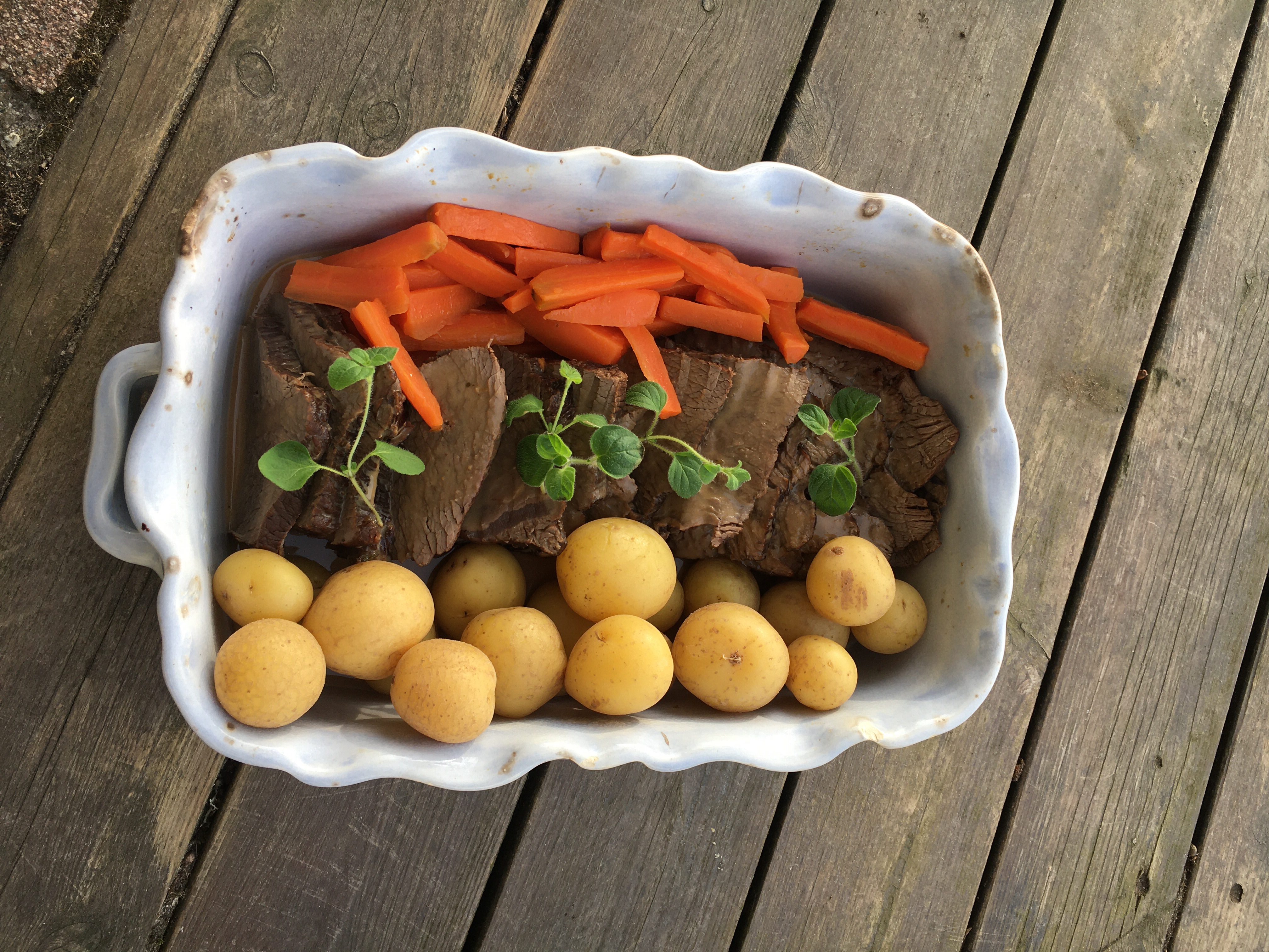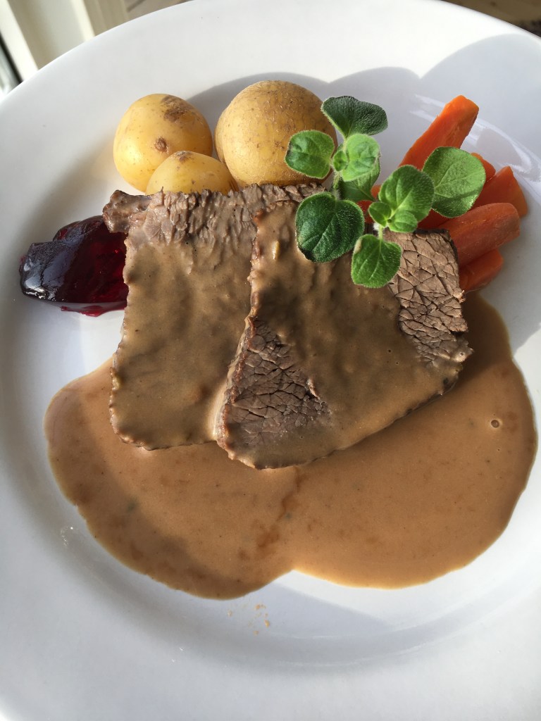 Välj en stek typ rostbiff, högrev. Jag bryner alltid köttet i smör först men det behöver man inte. Häll följande i en stekgryta: 3dl porter, 1dl koncentrerad svarta vinbärssaft. 0,5dl soja, 3buljongtärningar, 7 torkade enbär, 2gula lökar i bitar ( jag tog purjolök) 7 vitpepparkorn, 2tsk torkad timjan. Låt detta koka upp och lägg i köttet. Låt sjuda 1-1,5 Tim eller tills köttet visar 60-68 grader beroende på hur rosa man vill ha det. Vänd köttet under tiden. Ta av grytan och låt köttet dra medan man kokar potatis. Skär köttet i tunna skivor. Sila spadet tillsätt grädde, red av och smaka av med salt o peppar. Köttet serveras varm eller kallt med potatis, sås grönsaker och gelé