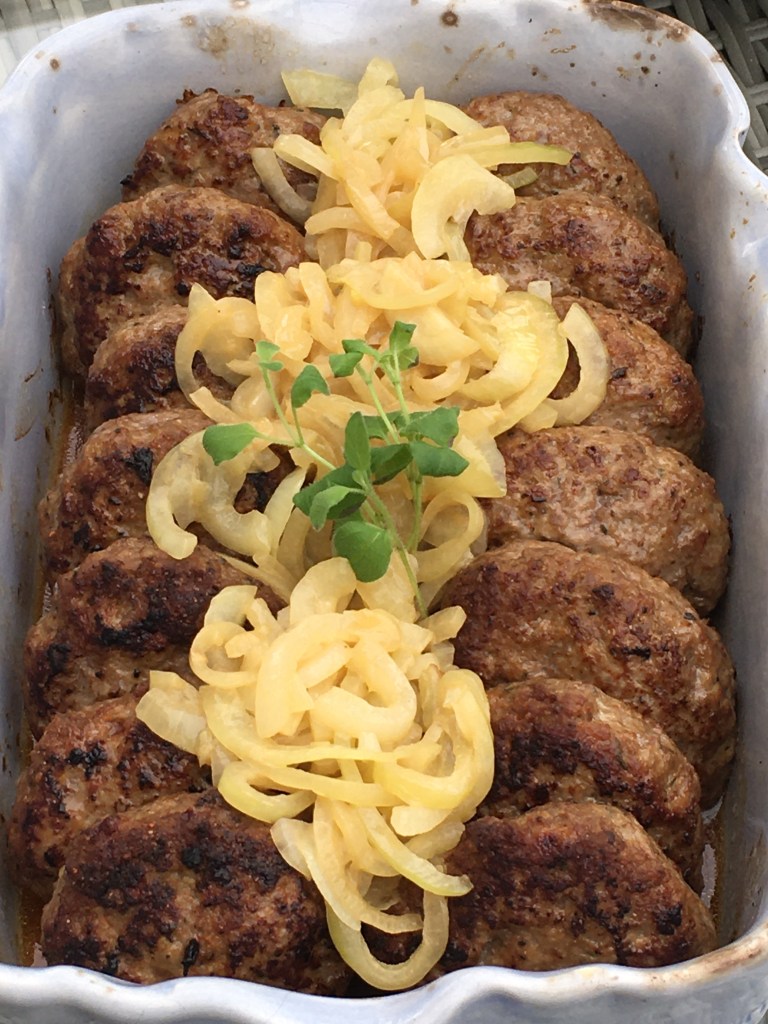Jag brukar ge dem en fin stekyta därefter låter jag dem gå färdigt i ugnen på 175 grader. Under tiden biffar blir färdiga steker jag lök långsamt i smör.
