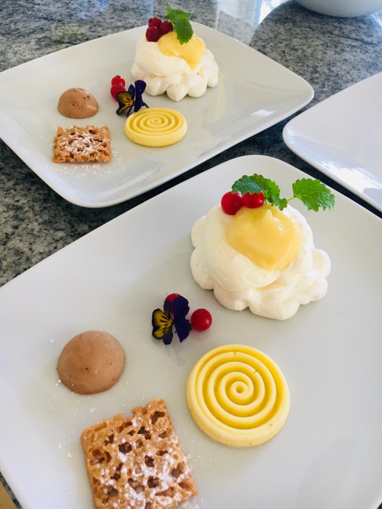 Till dessert serverade jag mini pavlova med lemoncurdgrädde, liten mangomousse och tobleroneparfait
