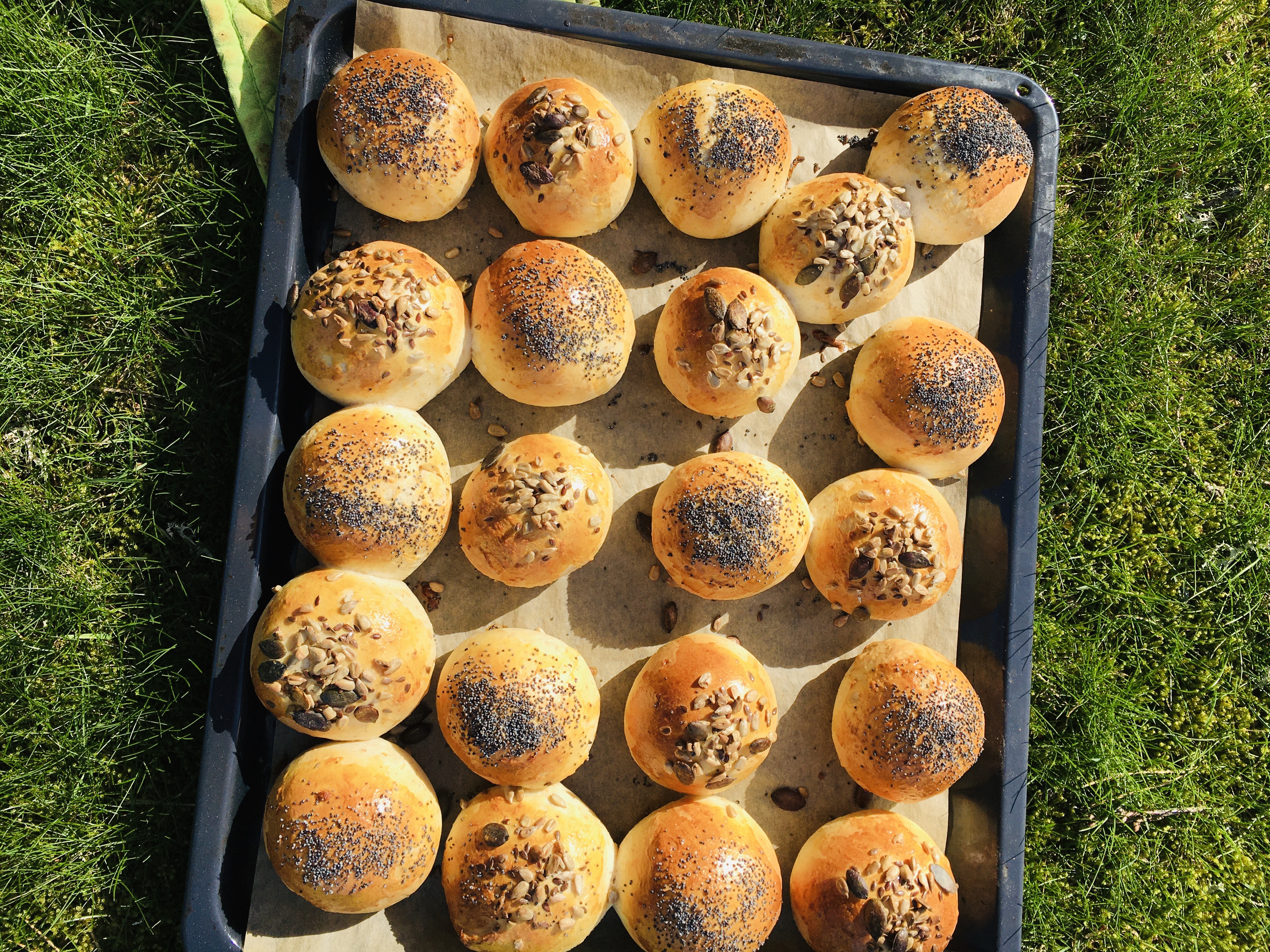När brödet jäser sista gången sätter du på ugnen på 220 grader. Grädda ca 15 min tills fin färg och de känns klara. Låt svalna under duk.