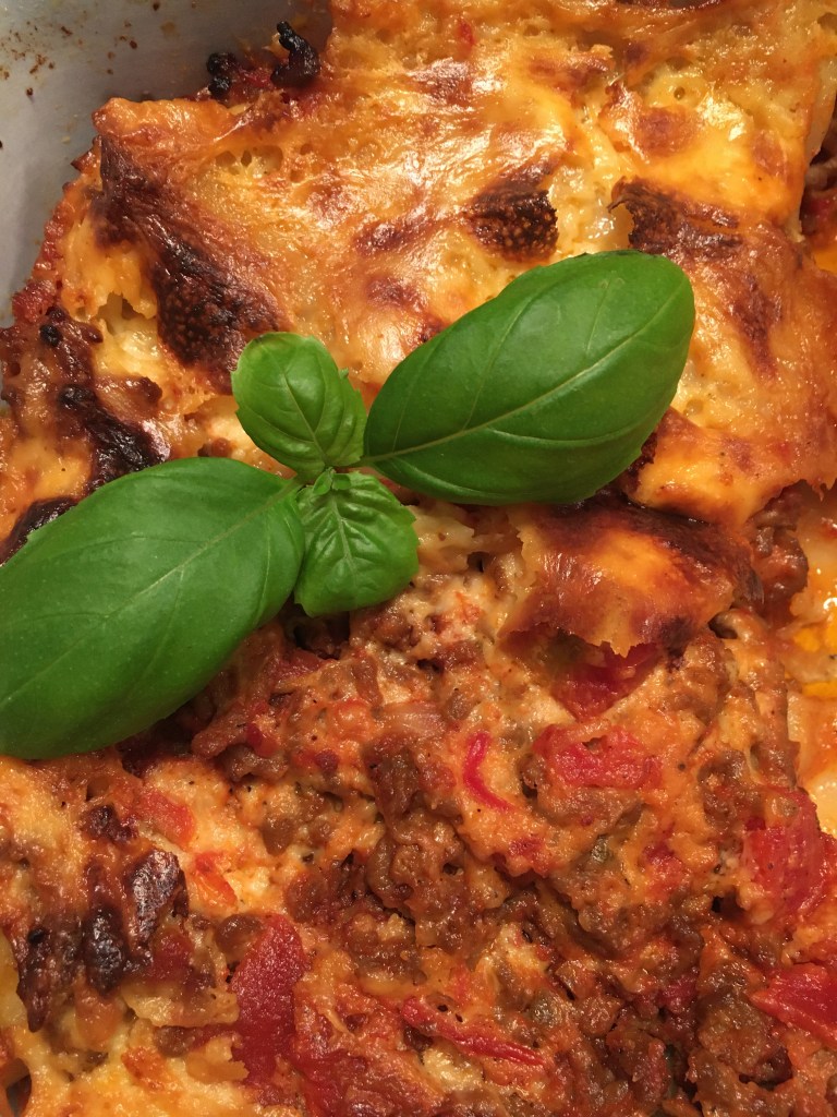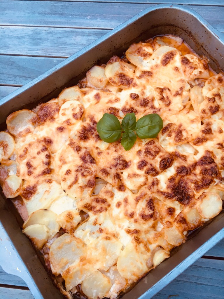 Gör en mustig köttfärssås på lammfärs. Jag hade både lök, vitlök, tomatkross och kryddade upp den med svartpeppar, oregano och kanel. Smakade av med ordentligt med salt. Gör en bechamel på både mjölk, grädde och ost. Jag är inte så förtjust i aubergine därför skivar jag potatis istället. Varva sen potatisskivor med köttfärssås och bechamel i en ugnsform. Avsluta med bechamel och lite extra riven ost. Grädda 40-50min i 175grader. Serveras med god sallad