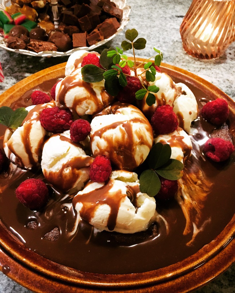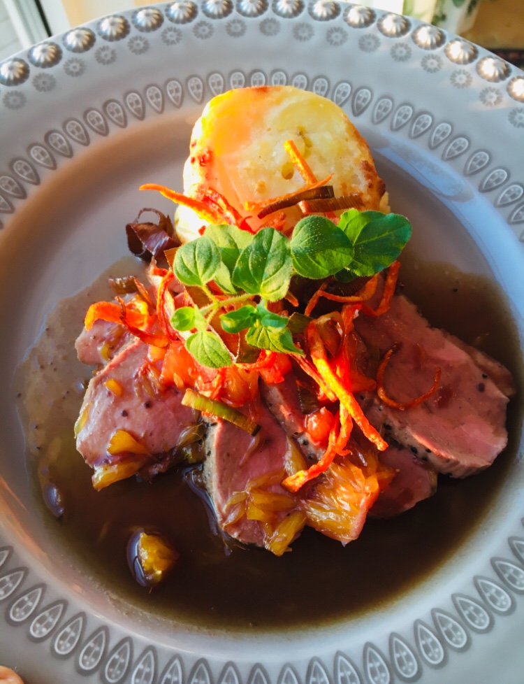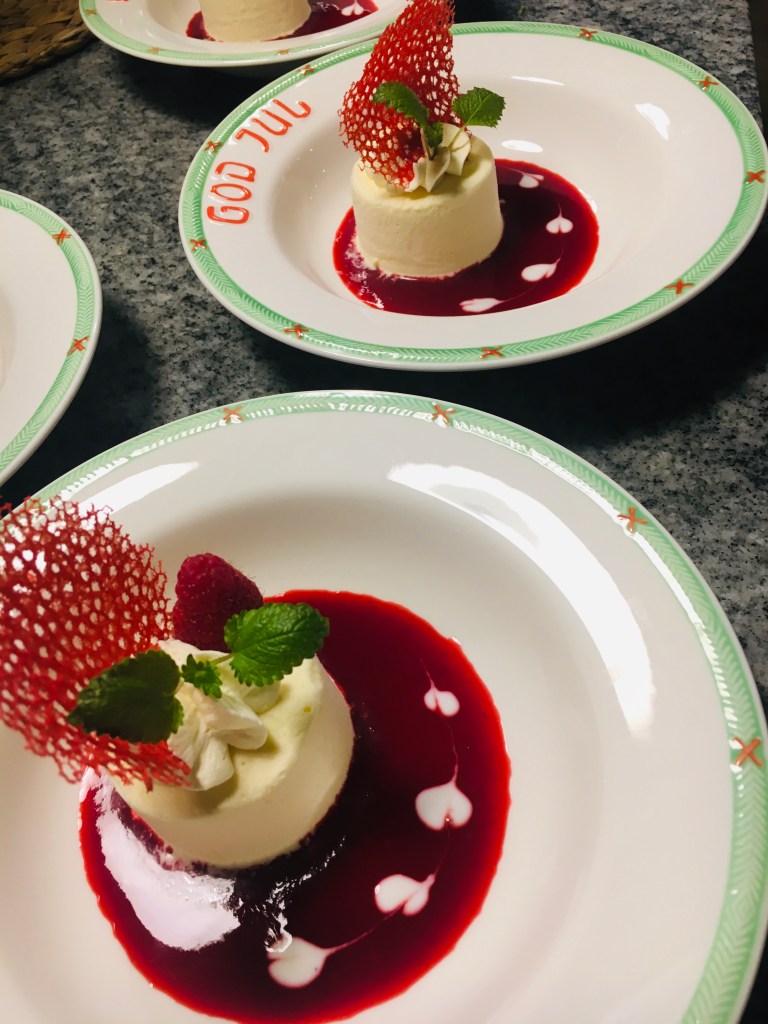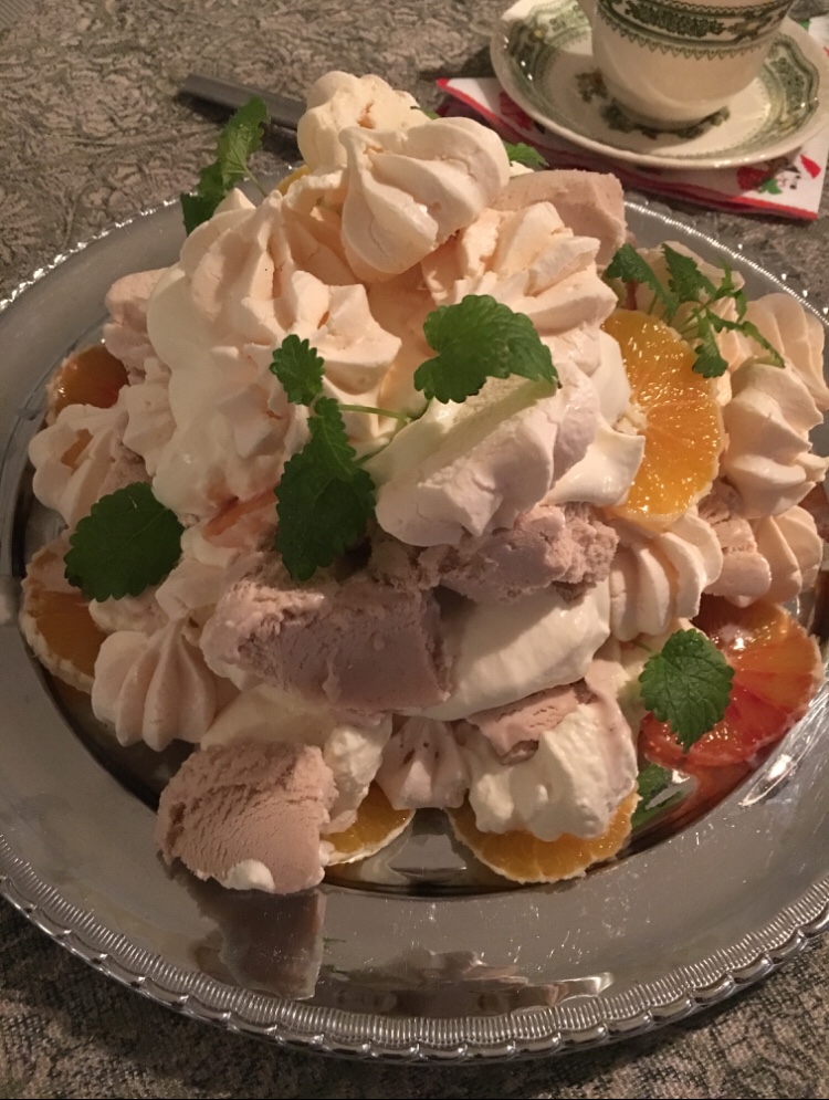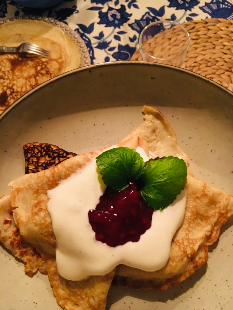 Skivade apelsiner med vispad vaniljgrädde, rostade mandlar och lite honung. Ca 15kr och det räckte också till 3 personer så 5kr/portion. Totalt kostade måltiden med hembakt bröd ca 11-12kr och jättegott dessutom. Till kvällen stekte jag pannkakor på 3 ägg och kostar ca 12-13kr med en klick sylt. Från lunchens dessert fanns det grädde kvar så ca 6-7kr/portion