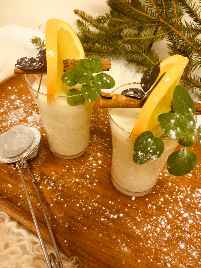Vispa ägg och socker fluffigt. Sjud mjölken och rör i äggsmeten. Tillsätt apelsinsaft, kanel och valfri alkohol. Vispa grädden lätt och rör i. Servera i små glas.