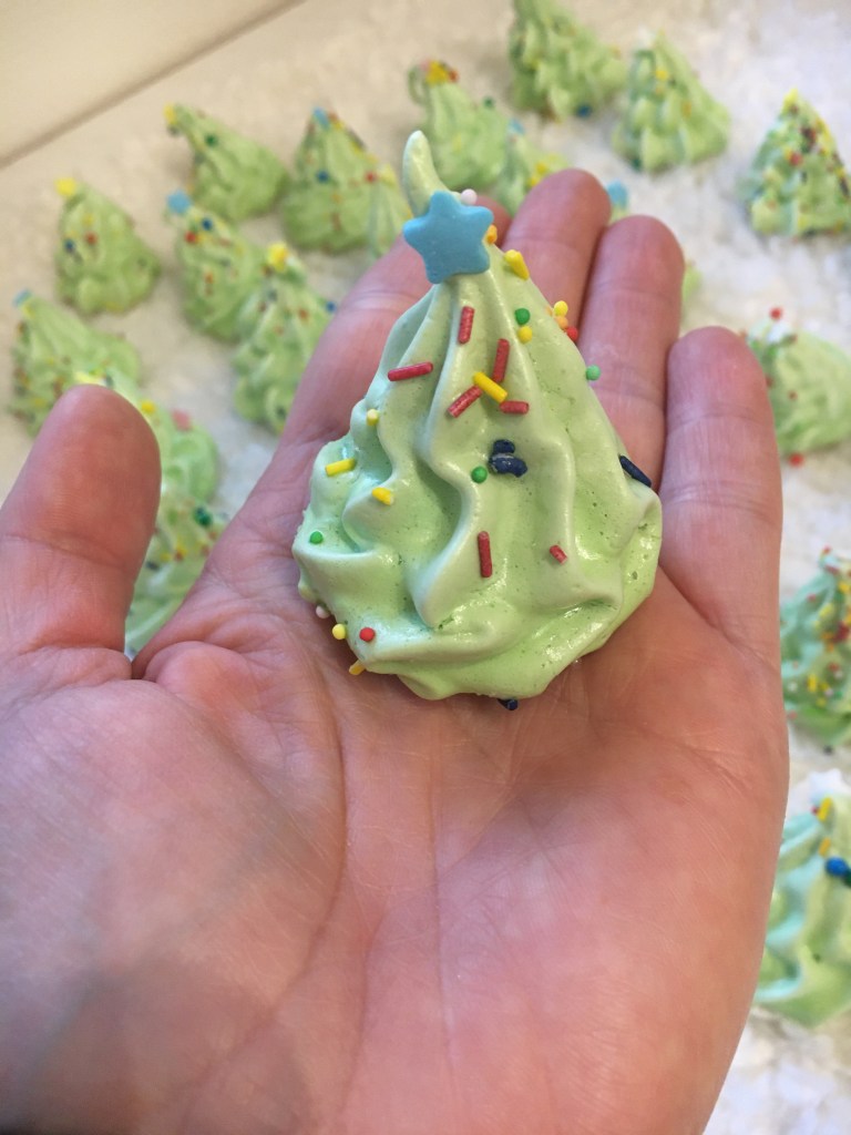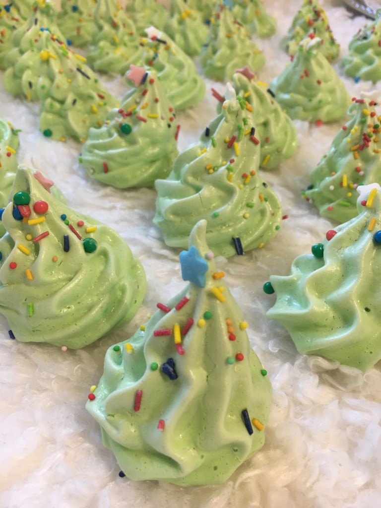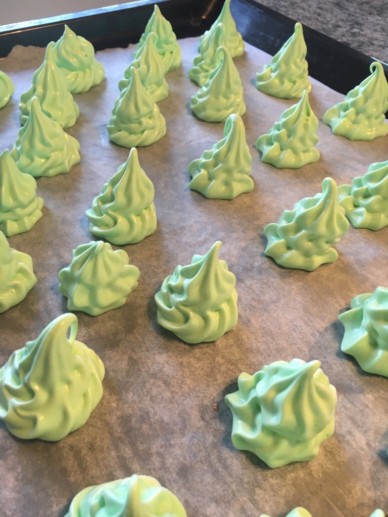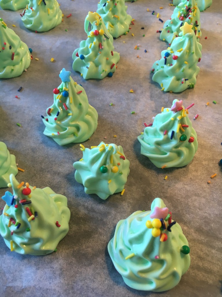 Sätt på ugnen på 100 grader.vispa 3 äggvitor med 1krm ättika och 0,5dl socker till hårt skum. Tillsätt 0,5 dl socker och vispa på högsta hastighet ett par minuter. Vänd ner 1 dl florsocker och spritsa ut maränger. Vill man ha julgranar färgar man smeten grön och strör lite strössel/kulor på.